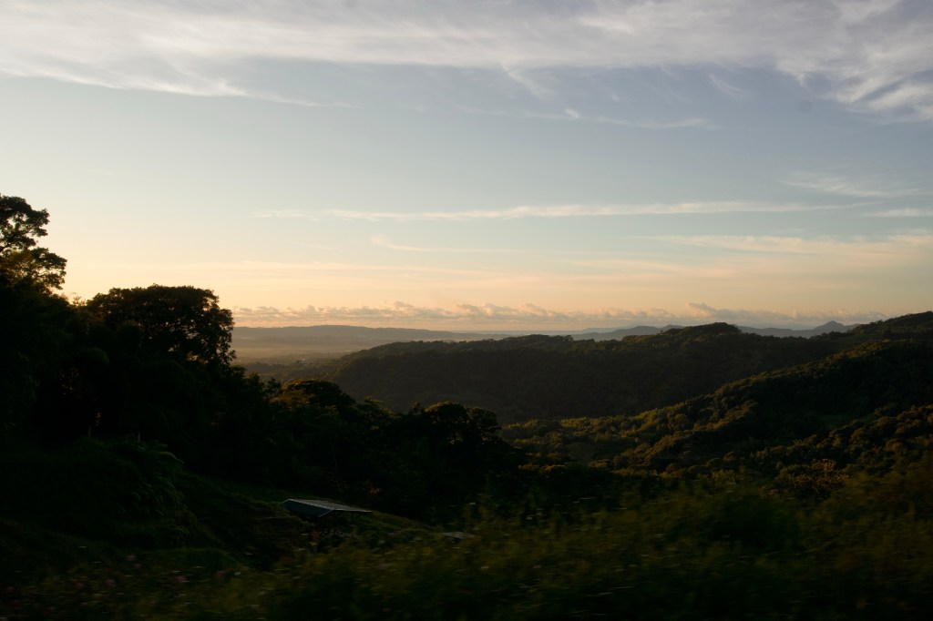Golden sunlight filters through the jungle’s leaves. We are eye-level with the clouds, gently driving through the day’s first hours. We pass a banana plantation, giant violet flowers dropping to the ground. From a break in the trees, jungle stretches graciously along the rolling hills. Our line of sight ends at our destination for the morning: the towering mount Pelé.